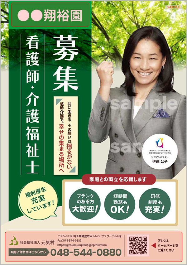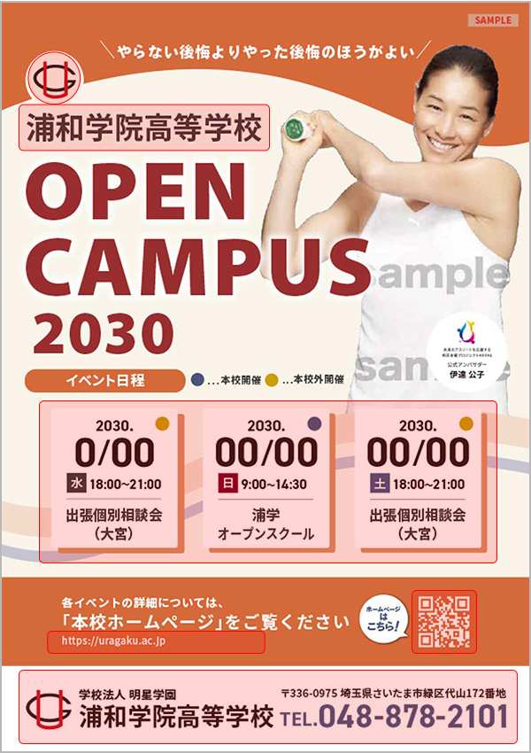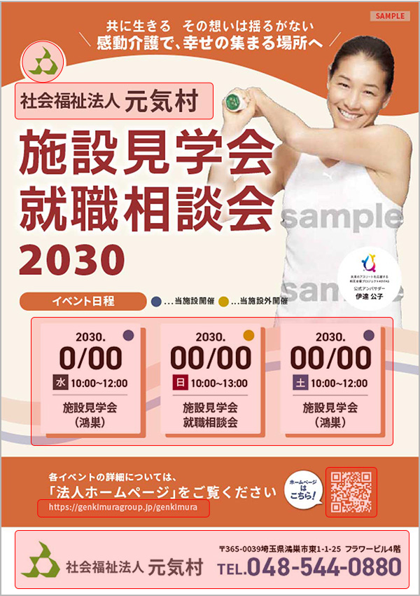 - ロゴマーク・会社名・法人名・学校名・住所・TEL・FAX・URLなど(赤枠箇所)の文字入れ可能です。